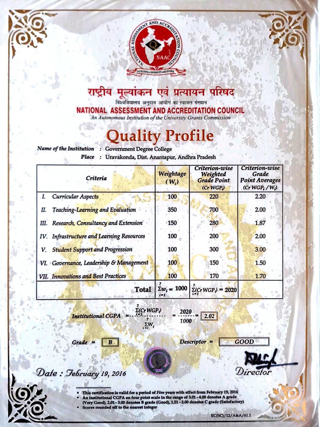 NAAC Quality Profile 2016
